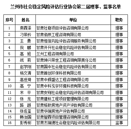会员大会投票选举产生了兰州市社会稳定风险评估行业协会第二届理事、监事,名单如下: